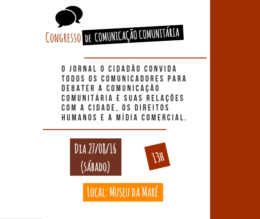 É para debater isso tudo que convidamos todas as comunicadoras e comunicadores populares e comunitários, jornalistas, publicitárias(os), trabalhadores do audiovisual, artistas, estudantes e demais interessados para o Congresso de Comunicação Comunitária no próximo sábado, no Museu da Maré, na favela Baixa do Sapateiro. O evento é aberto, gratuito, e vai das 13h às 19h.